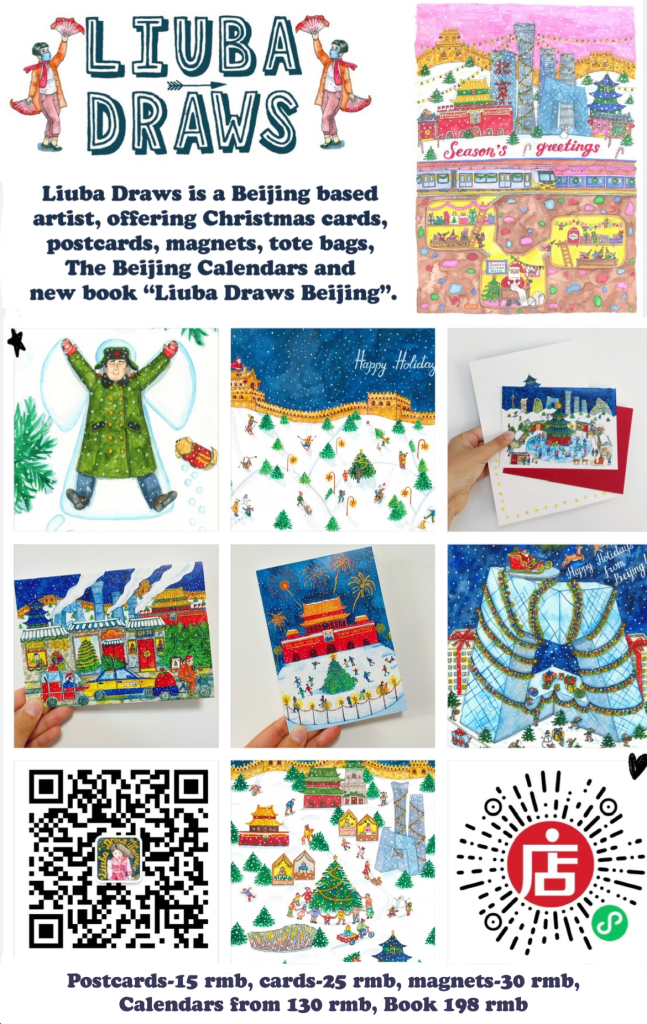 I was delighted to discover that in addition to calendars, tote bags and magnet, Liuba Draws also has a Christmas Card collection and a new book ‘Liuba Draws Beijing’. Any of these will make fantastic Christmas gifts or stocking stuffers.
