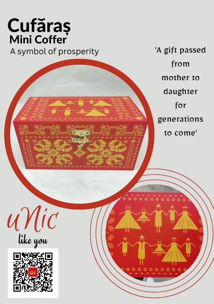 The beautifully crafted Beechwood box is decorated with traditional ethnic Romanian motives. Each motive has been carefully selected to represent what every mother wishes for her daughter in life. Hope and light, liberty, joy, passion, abundance, peace, equilibrium, protection and a North Star to guide her along the path of life.