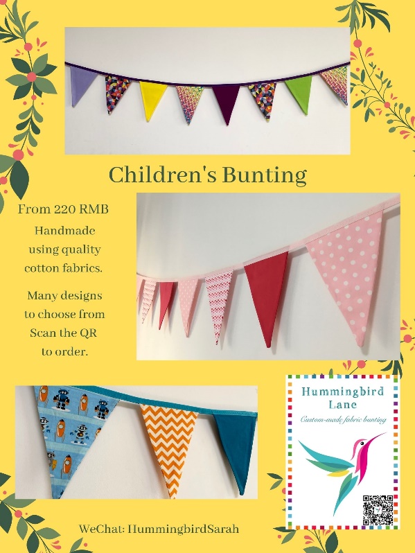 Reusable decorations reduce waste and bunting is perfect to give and send as gifts as it is compact and light weight! Sarah welcomes custom orders and can help you choose and design bunting to your specifications for any occasion.