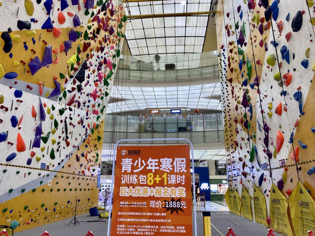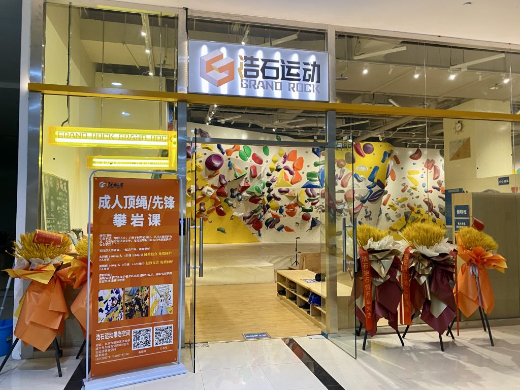 Grand Rock 浩石运动攀岩空间 (Hào shí yùndòng pānyán kōngjiān) is a well-rated and reputable indoor rock climbing business in Beijing, with a focus on the youth market. They have an outlet up in Huomao Place, a shopping plaza in the north of Chaoyang district in Laiguangying, and just recently opened a new store in Gold Long Shopping Center 久隆百货(酒仙桥店) Jiǔlóng bǎihuò (jiǔxiān qiáo diàn) in the Jiuxianqiao area.