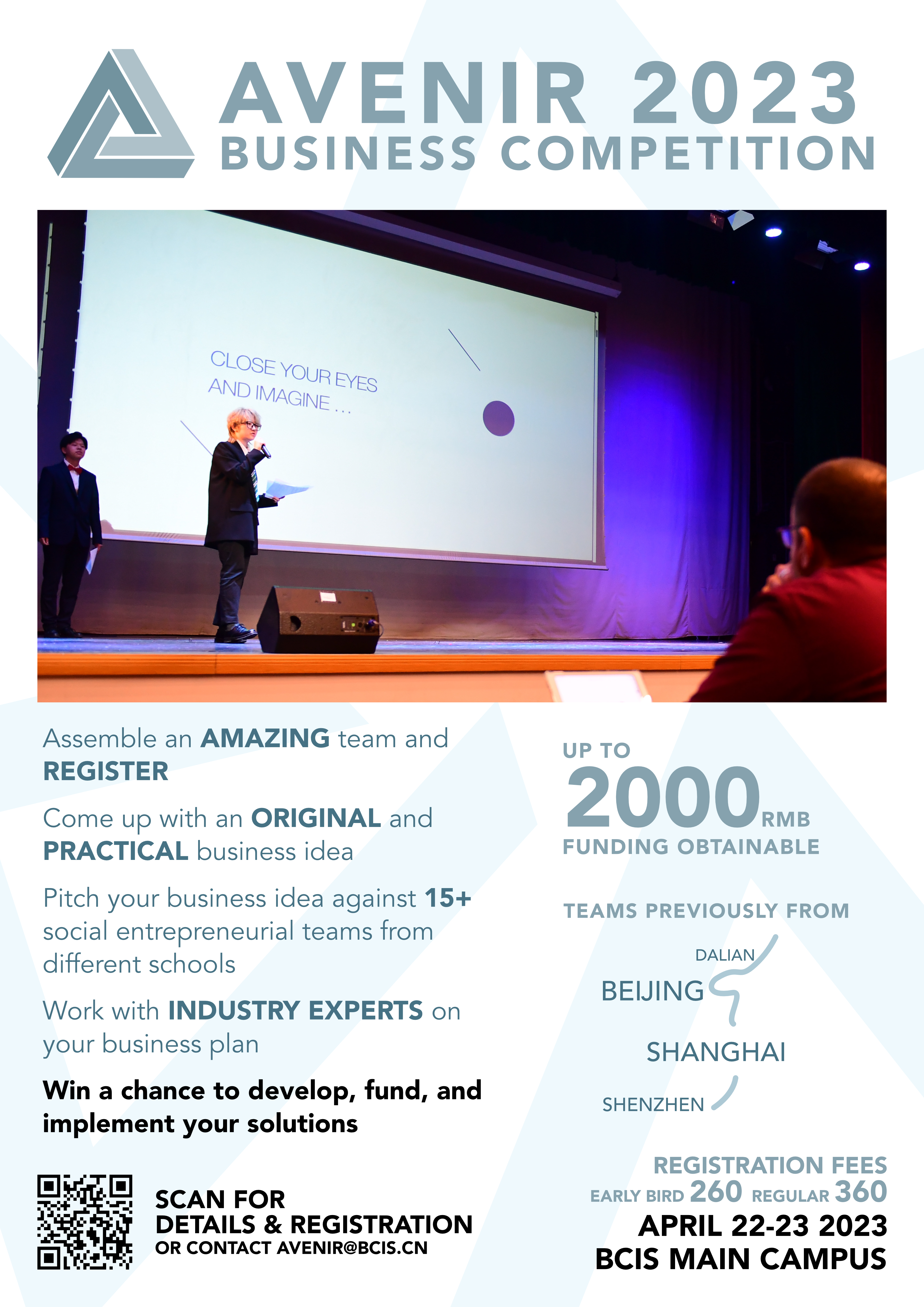 This year’s Avenir competition is also currently looking for sponsors, speakers, mentors, and judges. Please email Avenir at avenir@bcis.cn and erica.wang@bcis.cn for more information.