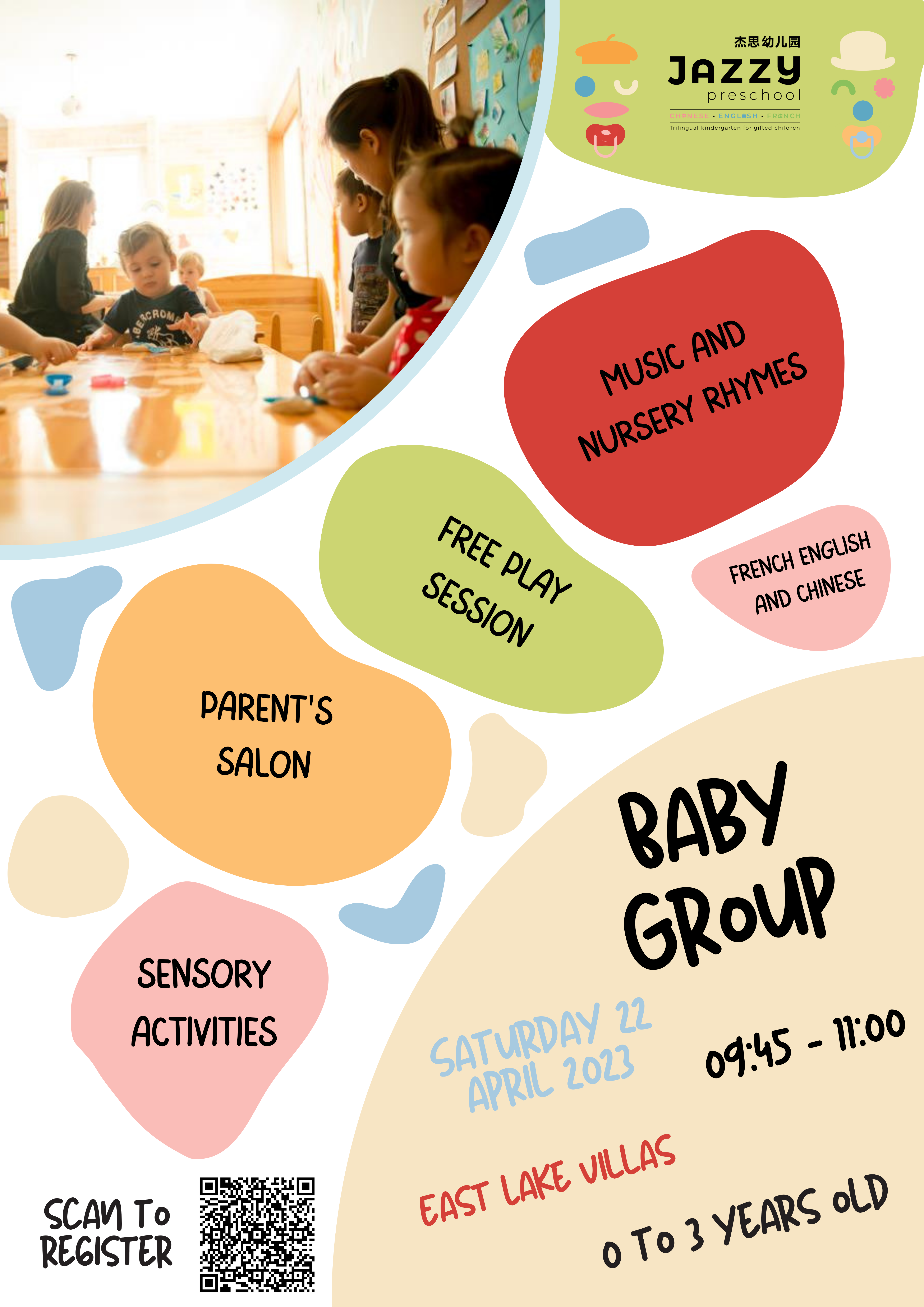 Besides the open day, Jazzy Preschool will organize a baby group for children from 0 to 3 years old and their parents! Join to participate in parent-child bonding activities accompanied by their English, French, and Chinese early childhood professionals, as well as to meet other parents and enjoy a fun time together. The activities will include: