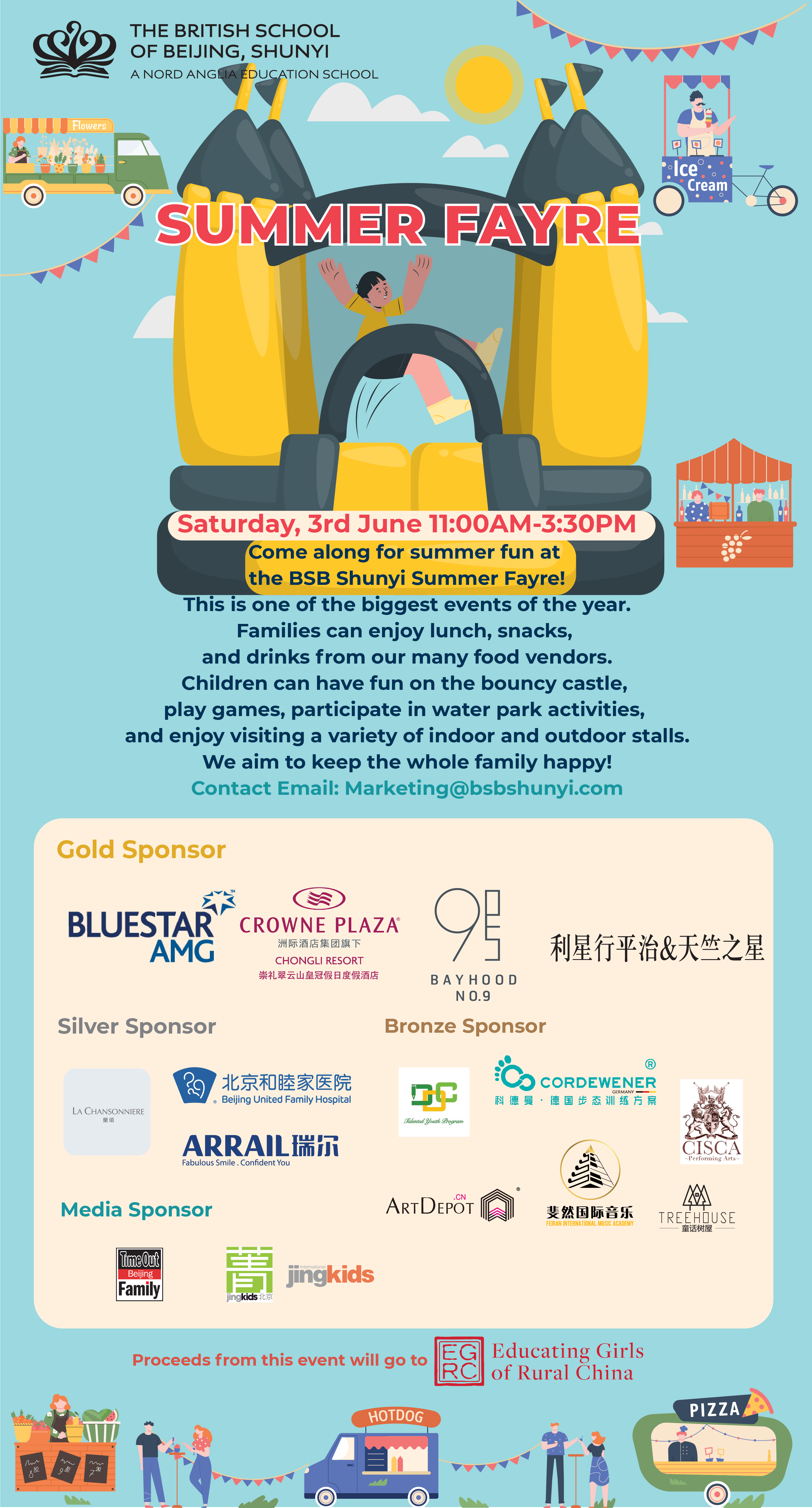 Come along for summer fun at The British School of Beijing (BSB) Shunyi. Bring your friends and family along, it’s open to the whole Beijing community! This is one of the biggest events at BSB. Families can enjoy food and drinks from local vendors, have fun with games, water park activities, bouncy castles, and shop at a variety of indoor and outdoor stalls. The event is for the whole family and proceeds will go to Educating Girls of Rural China.