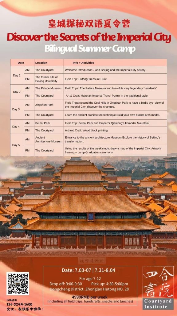 2) Discover the Secrets of the Imperial City Bilingual Summer Camp: Explore the mysterious imperial city and visit traditional ancient buildings on site, along with royal handy craft and art workshops