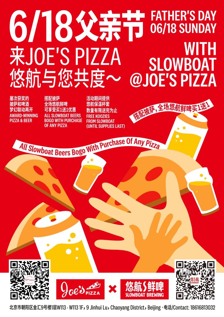 But that’s not all! Feel like staying in or going to the park for the big day? Joe’s Pizza will be running an excellent delivery special. Order any pizza from Joe’s through the delivery apps (Meituan, Eleme, Sherpa’s) and get a can of Slowboat Monkey’s Fist or You Dian Xiang Wheat for only 20 RMB!