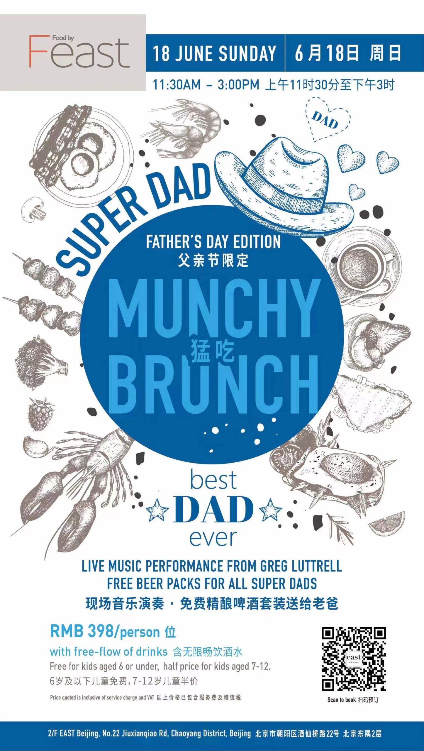 Dads, treat yourselves to a great Father’s Day at FEAST. The Munchy Brunch Father’s Day Edition offers everything you need to feel special: amazingly delicious food, free beer, and live music! If you have little ones aged 6 or under, they can eat for free – it’s half price for kids aged 7-12. And don’t forget about the super fun play space for them to run around while you’re enjoying your cold one. Scan the QR code on the poster to book.