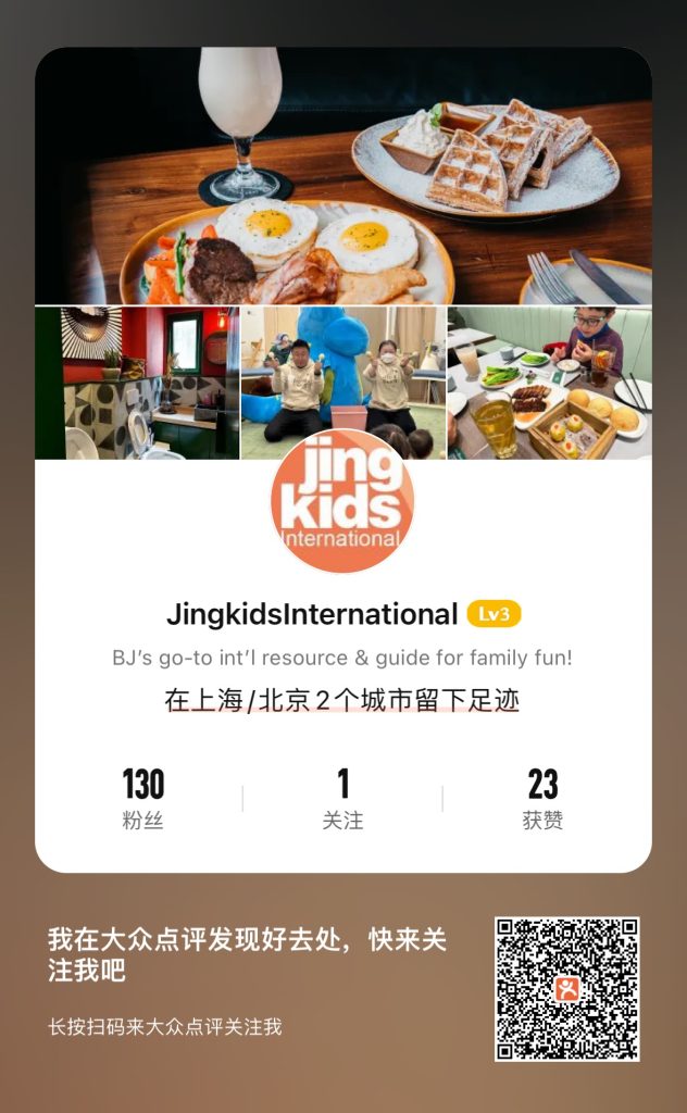 Jingkids has been a busy busy bee buzzing all over Beijing in the last week – our team contributed a total of 6 reviews under our account on China’s essential dining and exploring app DaZhongDianPing, better known as Dianping – we reviewed four restaurants, outdoor campsite/playground/vineyard Shenglu Manor and also Sci-Tech Outlet Mall. Scan the QR code below to read the full reviews!