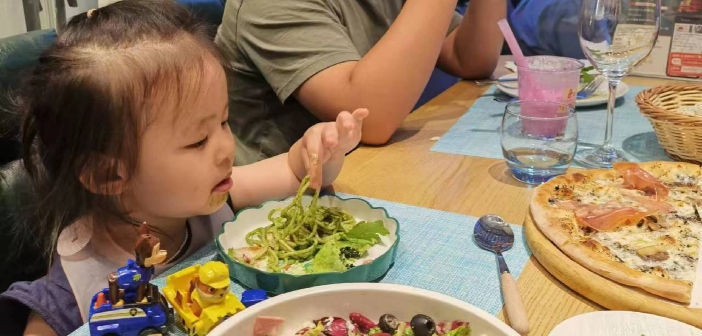 My picky toddler devoured the handmade ricotta and spinach ravioli (RMB 79) and pesto pasta (RMB 69) without stopping, and followed up by licking her dessert plate clean…