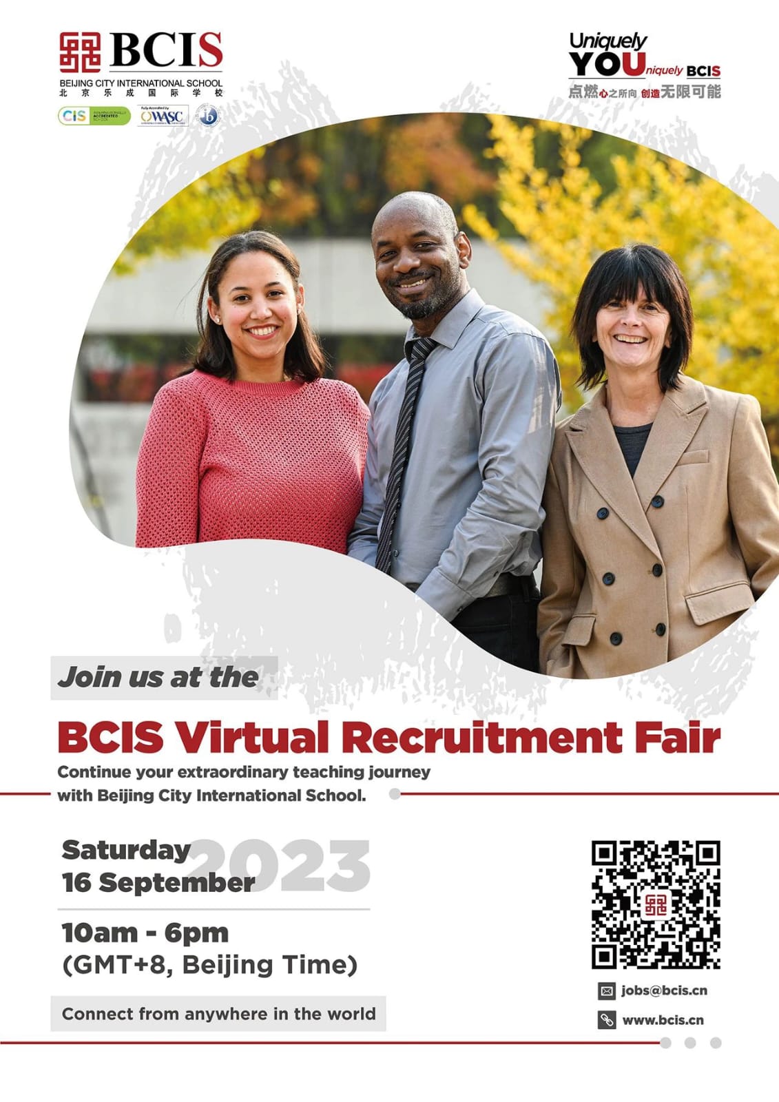 The Beijing City International School (BCIS) virtual recruitment fair is set to take place on Sat, Sep 16, 2023.