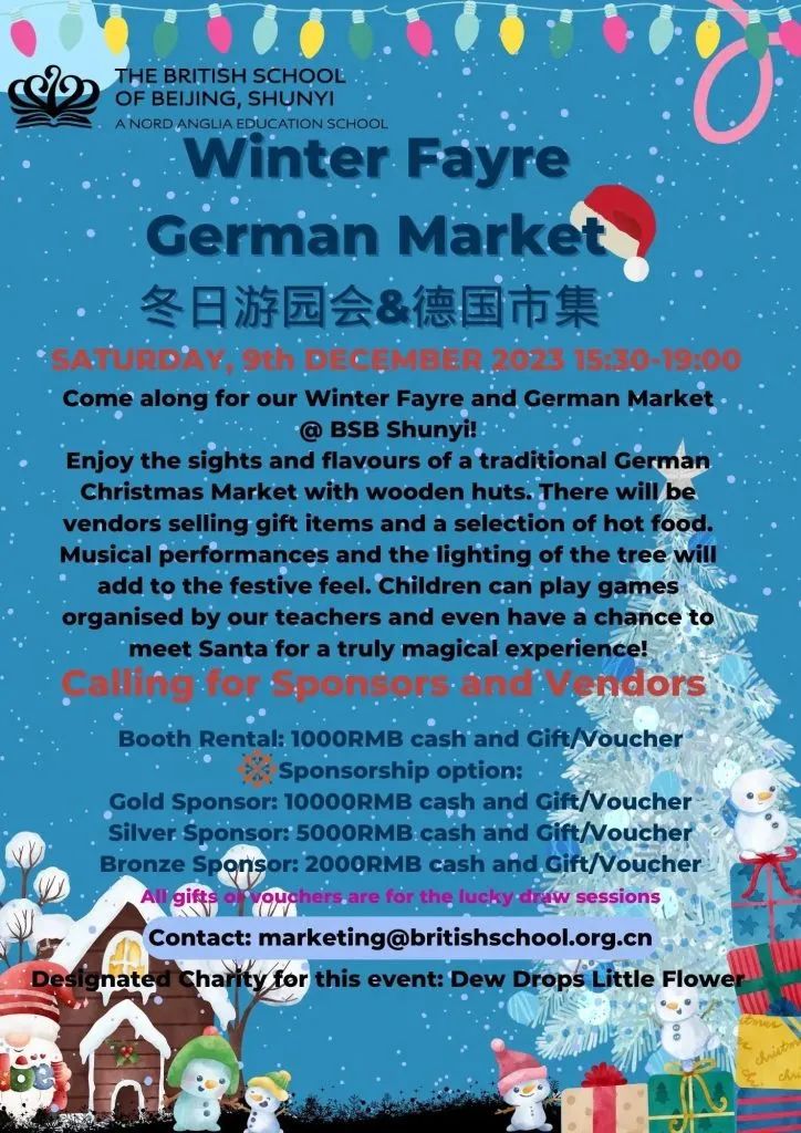 Enjoy the sights and flavors of a traditional German Christmas Market with wooden huts as well as vendors selling gifts and hot food. There will be musical performances, the lighting of the Christmas tree, and festive games by teachers for the kids. Don’t miss the chance to meet Santa as well! All proceeds from the event go to Dew Drops Little Flower charity. There may still be spots left for interested vendors and sponsors. To get more info, contact the BSB Shunyi marketing team at marketing@bsbshunyi.com.