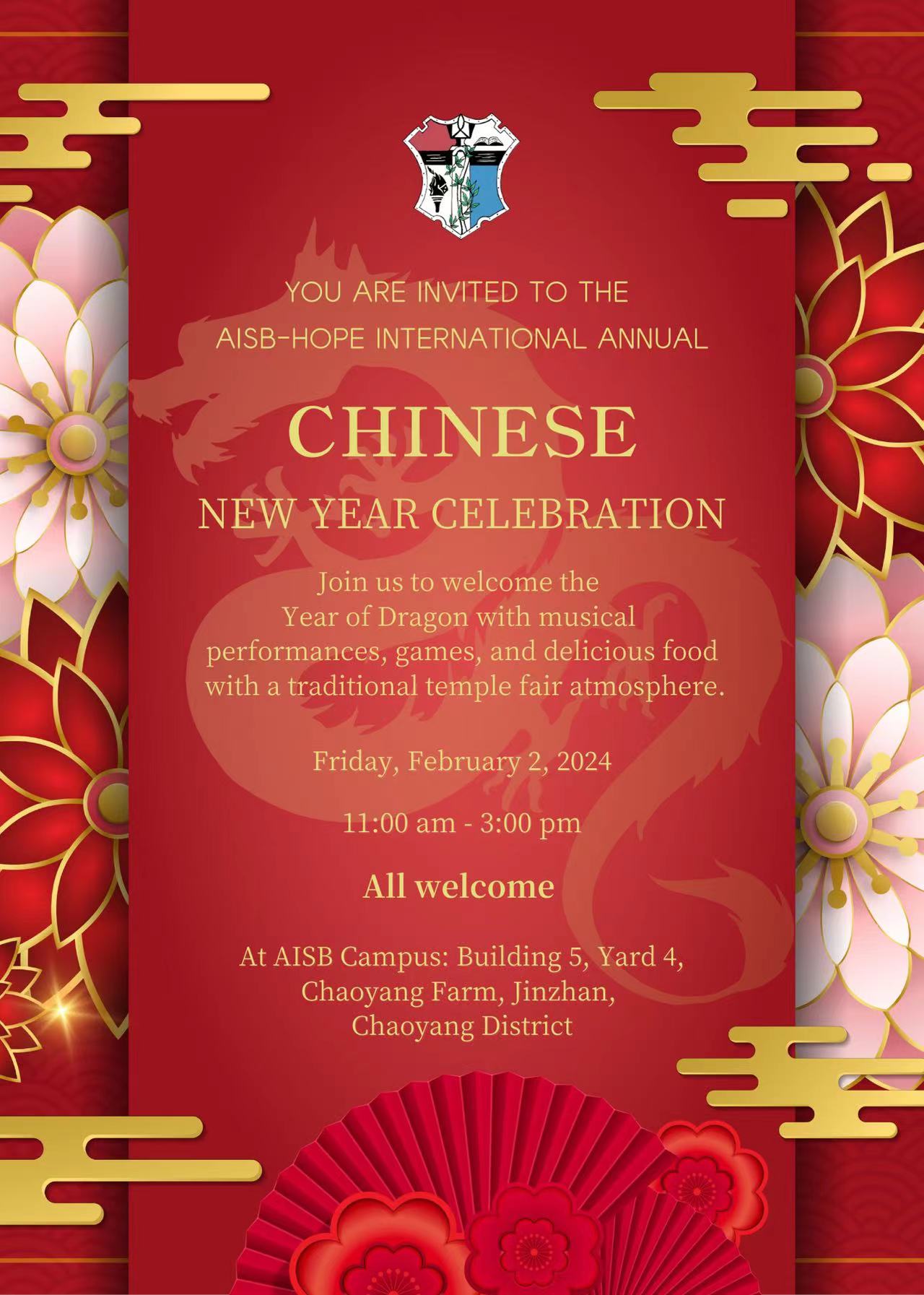 You and your friends and family are welcome to join the AISB-Hope International annual Chinese New Year celebration with musical performances, games, and delicious food with a traditional temple fair atmosphere. This event is open for all. For more info, call 8431 2141.