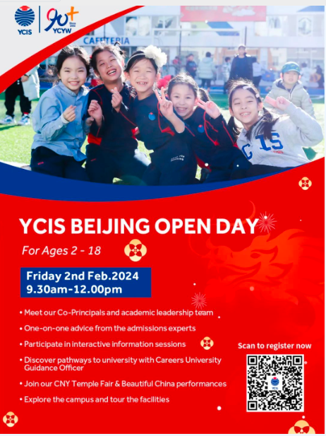 The YCYW network of schools was founded in Hong Kong 90 years ago. Since 1932, YCYW has transformed into a modern, international education network of schools leading the way in developing students into ambitious, kind and responsible future leaders. Yew Chung International School (YCIS) Beijing opened in 1995 with the aim of bringing the educational philosophy, objectives and pedagogy of Yew Chung to Beijing’s expatriate families. Over the past 28 years, YCIS Beijing has grown rapidly and now has a student body of over 800 who come from over 40 nationalities and are educated by teachers from 30 countries under an international curriculum that nurtures globally minded students. Scan the QR code on the poster to join their open day activities.