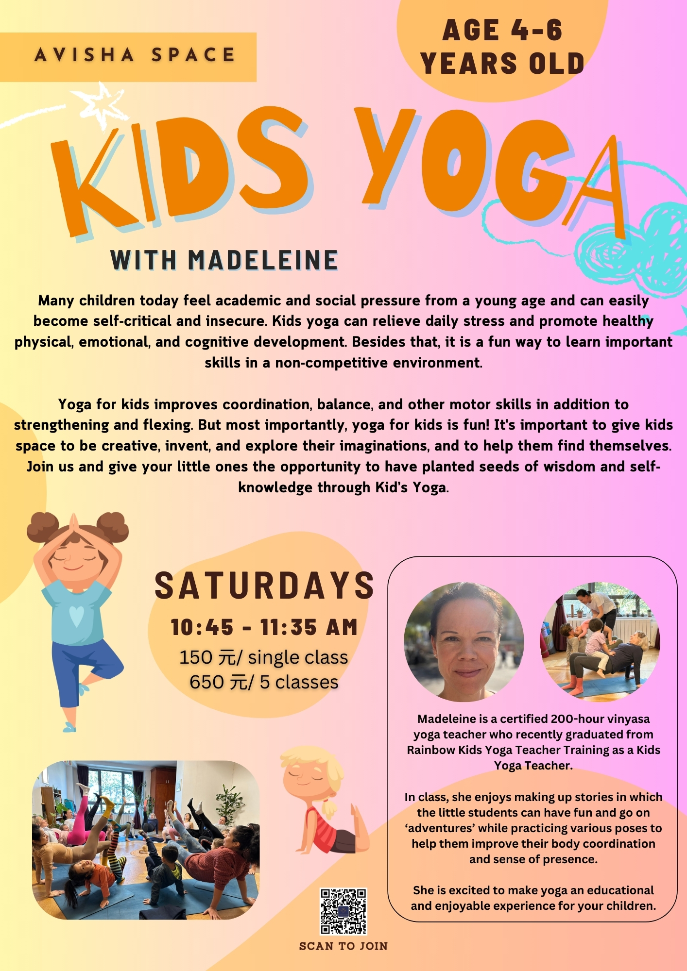 Improve your health, your posture and your mood at one of Avisha’s specially designed yoga classes. Depending on the stage in your life you’re currently at, you can choose between prenatal or mama and baby classes, or if you have an older kiddo, you can spend some quality time together doing age-appropriate stretches and activities in kids yoga sessions on Saturdays. The Prenatal Yoga and Mama & Baby classes are held on Wednesdays and Thursdays and are led by Silvana. Kids Yoga takes place on Saturdays and the kids get to enjoy the fun and healthy environment with Madeleine. Scan the QR codes on the posters to register.