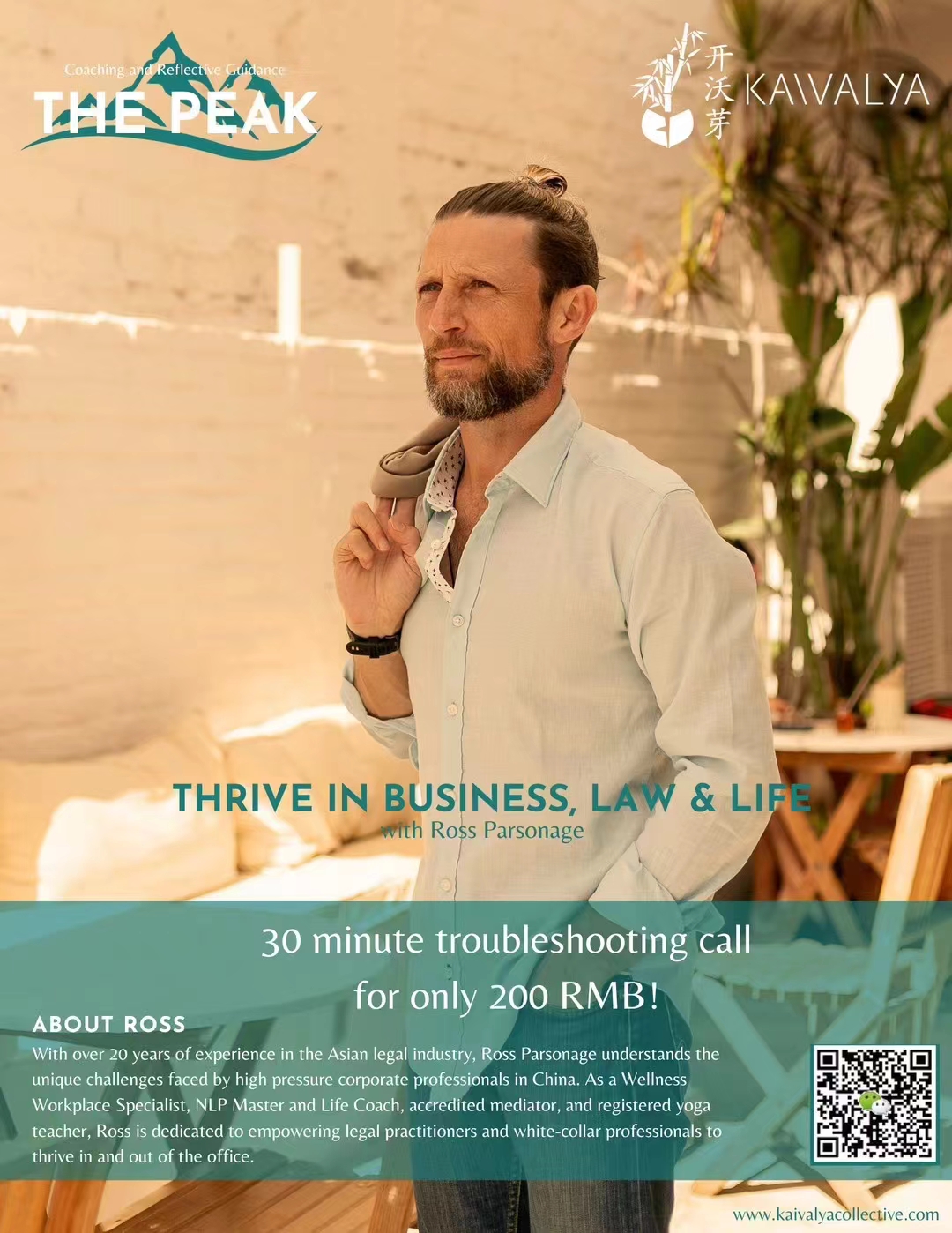 Ross Parsonage is known by some as “the yoga guy from Taozi Tree,” to others as a super dad to four kids – Kai (8), Mia (6), Mateo (3), and Javi (3 months) –and to many clients as their trusted confidant. He’s got over 20 years of legal industry experience in Asia and understands the complexity of working in corporate China. In addition to that, he’s a wellness workplace specialist, NLP master and life coach, accredited mediator, and registered yoga teacher. Ross is passionate about empowering professionals to thrive in and out of the office.