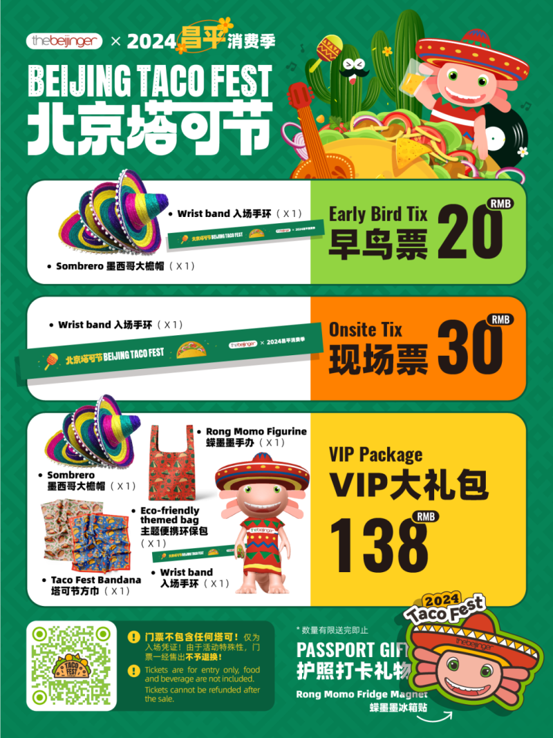 Taco Fest is back for its second year, coming to Tiantongyuan Culture and Arts Center from Apr 20 to Apr 21. It’s time to grab your tickets, with early bird tickets on sale from today! Ticket packages are just like last year, standard and VIP, with a few new goodies up for grabs in the VIP package like new bandanas and swag featuring our Taco Fest mascot, Rong Momo the axolotl! For those of you with kids, we also have a special offer where kids under 1.4 meters get in for FREE before 2pm. The venue is also pet friendly, so feel free to bring your furry friends along too!