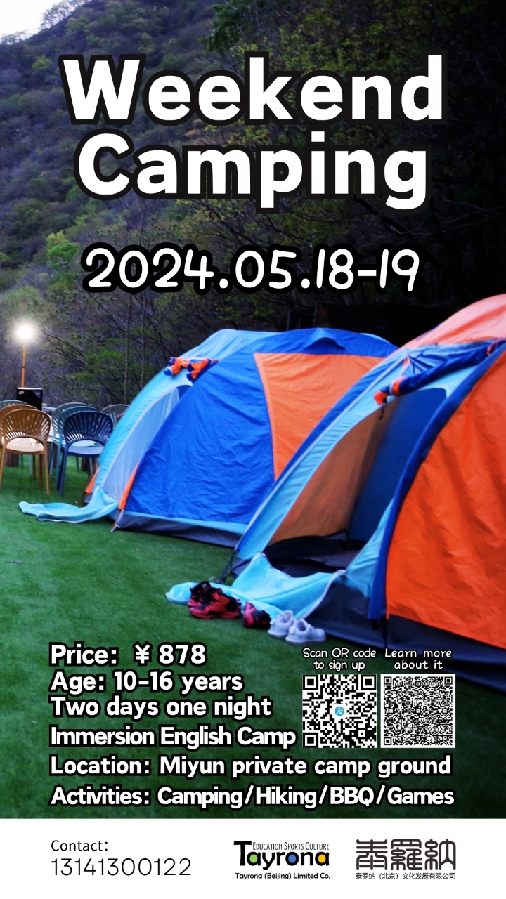 With Tayrona, you learn practical skills, and while doing that you enjoy spending time in nature. There are a few camping events coming up; some are for families, others are for kids and teens, and there are also activities for people 18-35. If you want to plan your own camping trip at a private campsite near Beijing, feel free to contact the organization. For more info, scan the QR code on the poster.