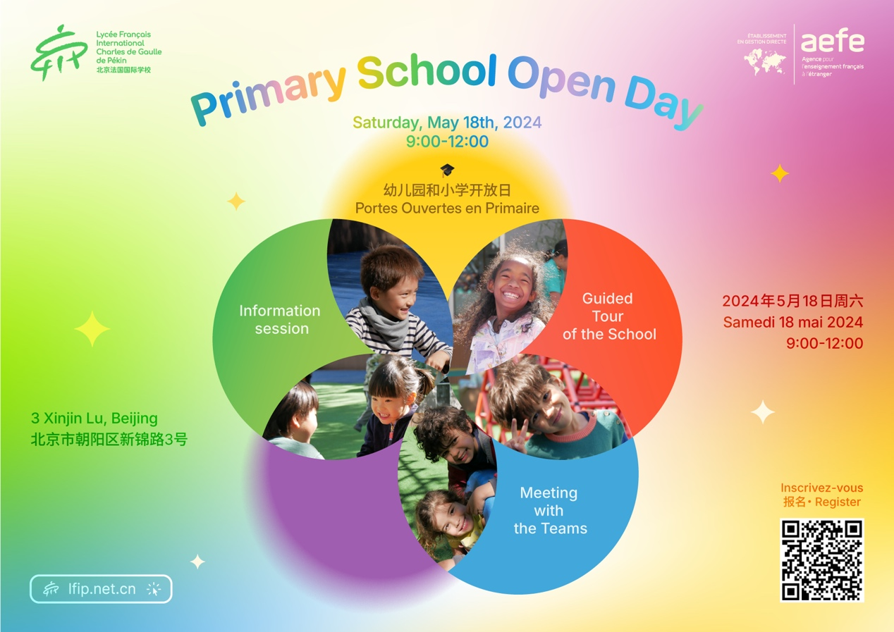 The French International School of Beijing (LFIPékin) welcomes you to its Primary School open day, which will take place on Sat, May 18, from 9am.