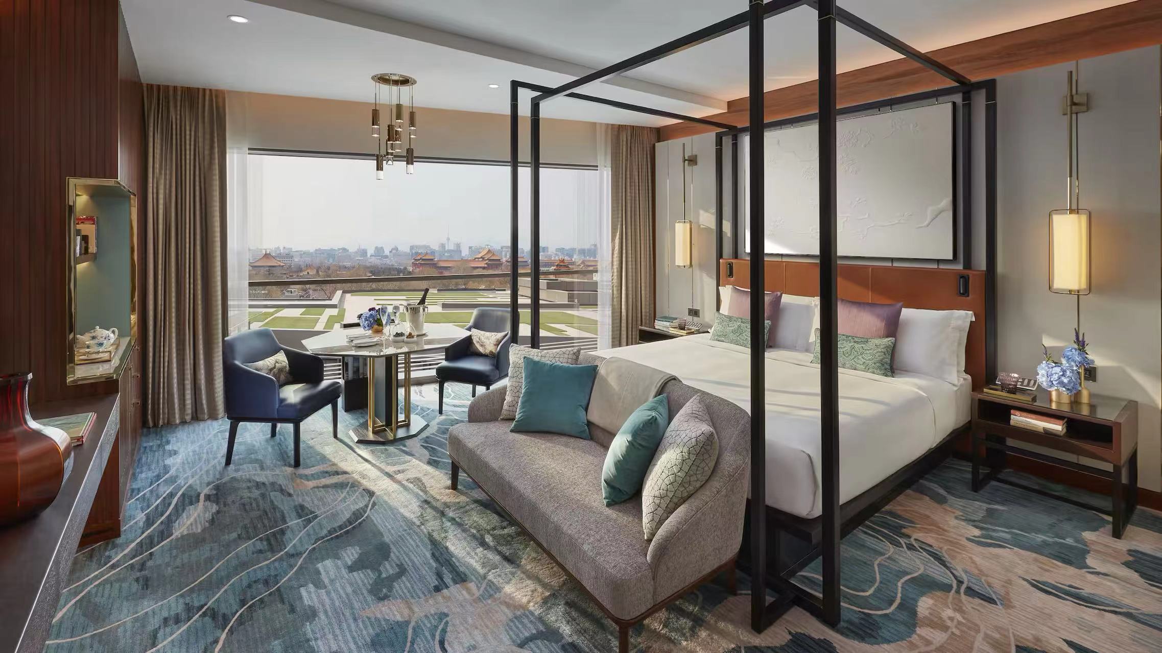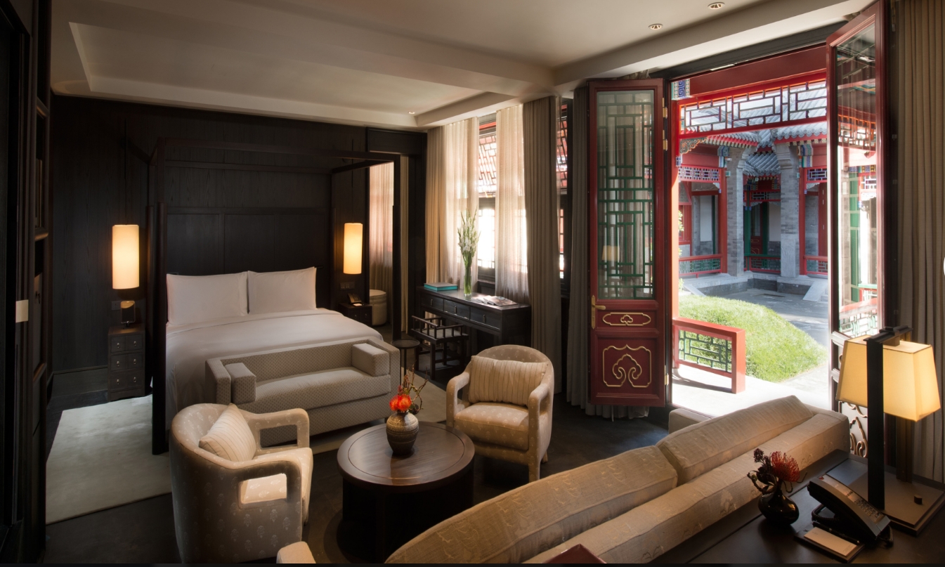 Overlooking the Forbidden City, the location is a highlight of this hotel. Multiple dining options include Cantonese, New York-style steakhouse, and late-night bar/lounge-style restaurants. Options for stays range from one-bed rooms to the presidential suite, all incorporating Chinese-inspired designs from colorful carpets to landscape paintings. Facilities available to guests include a spa, indoor pool, and discovery tours in Beijing. Thanks to the central location and attention to detail, the prices of these rooms start at about RMB 5,000 per night for a Deluxe Room.