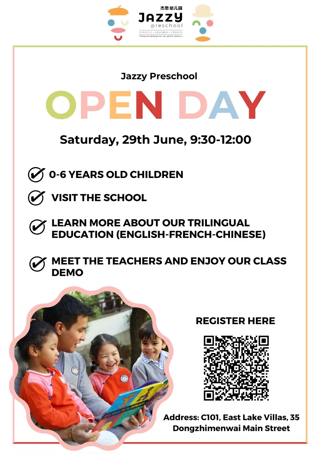 Discover Jazzy Preschool’s unique, trilingual education (English, French and Chinese) at their upcoming open day. Join to learn more about their curriculum, meet the staff and enjoy activities in their beautiful Suzhou Garden. Scan the QR code to register.