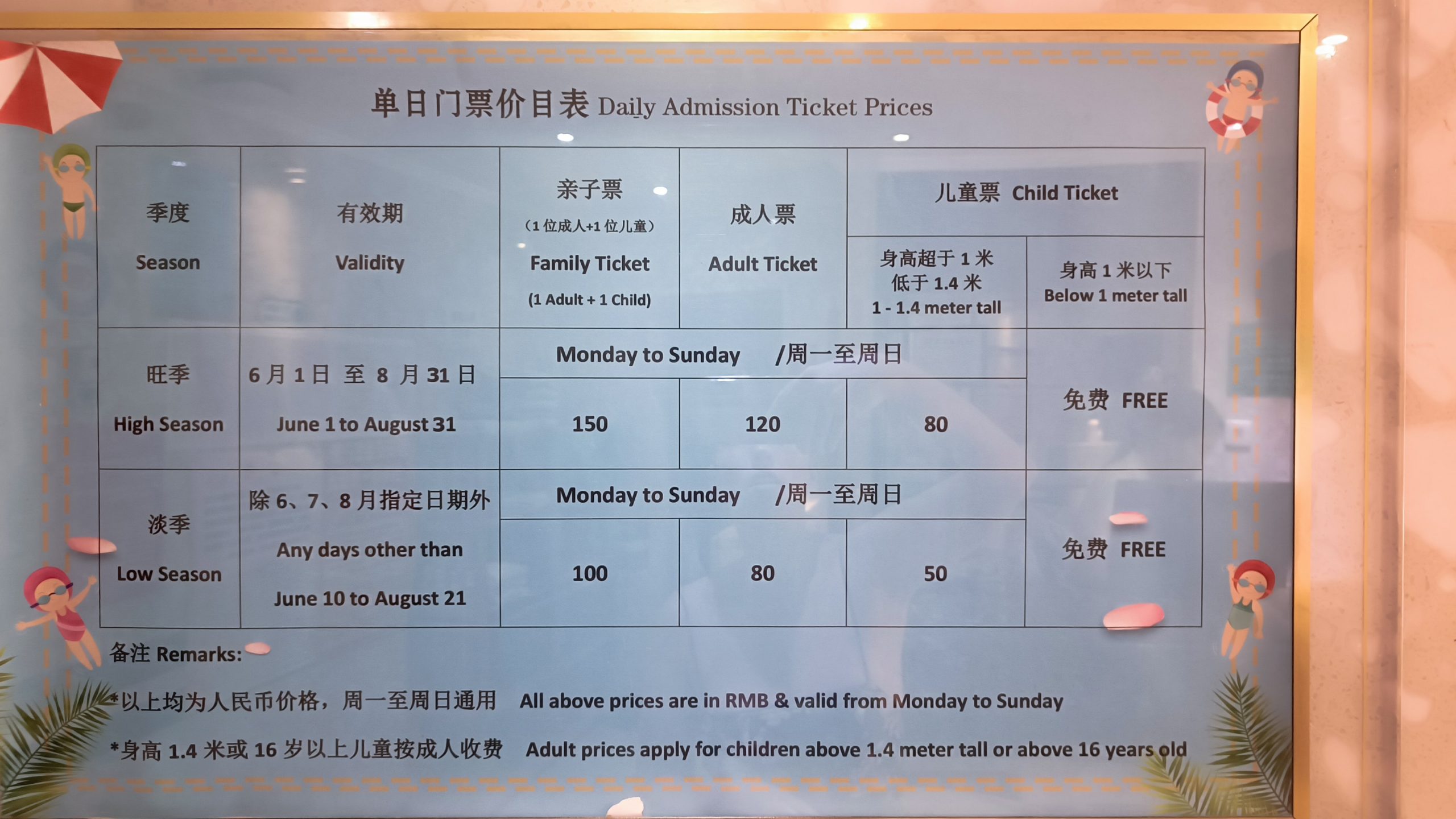Tickets are RMB 120/person and RMB 80/child (1m-1.4m tall) and kids under 1m get in for free. There is also a family ticket for one adult plus one child for RMB 150. Towels are available for free at the front desk.