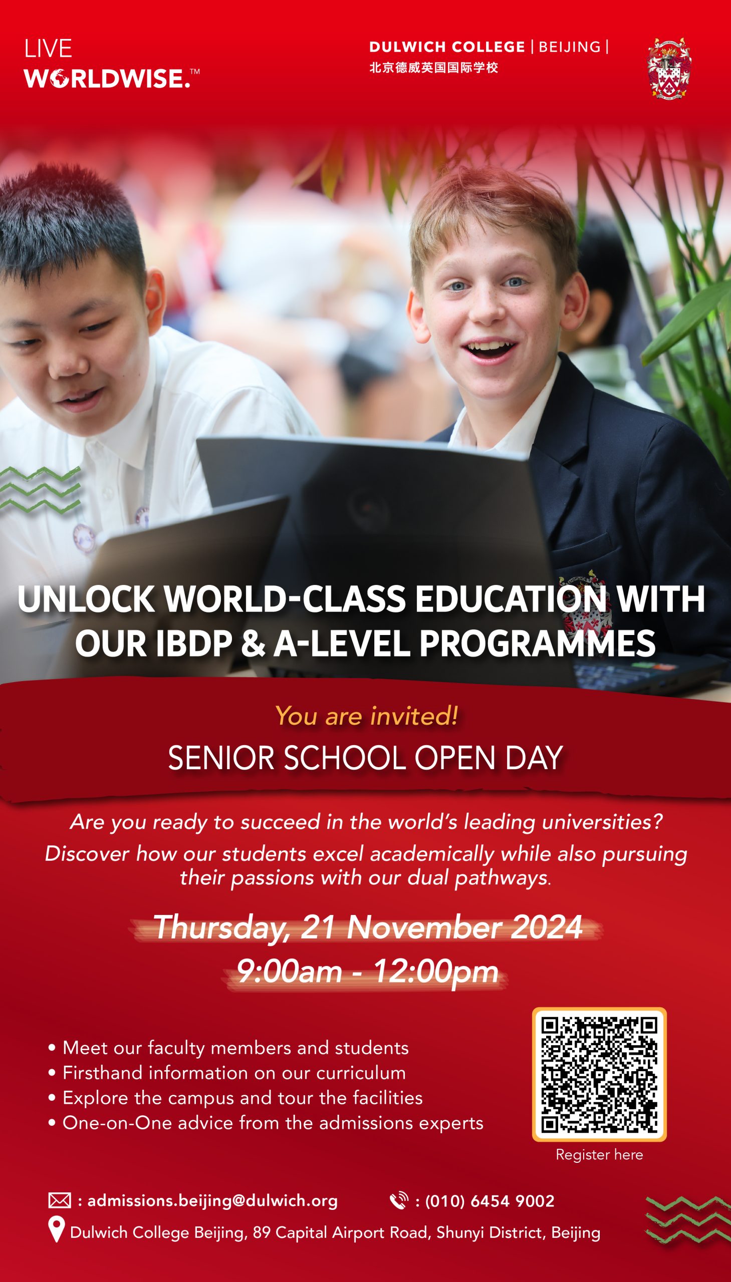 Dulwich College Beijing welcomes prospective families and students in Senior School (Age 11-17) to its on-campus open day.