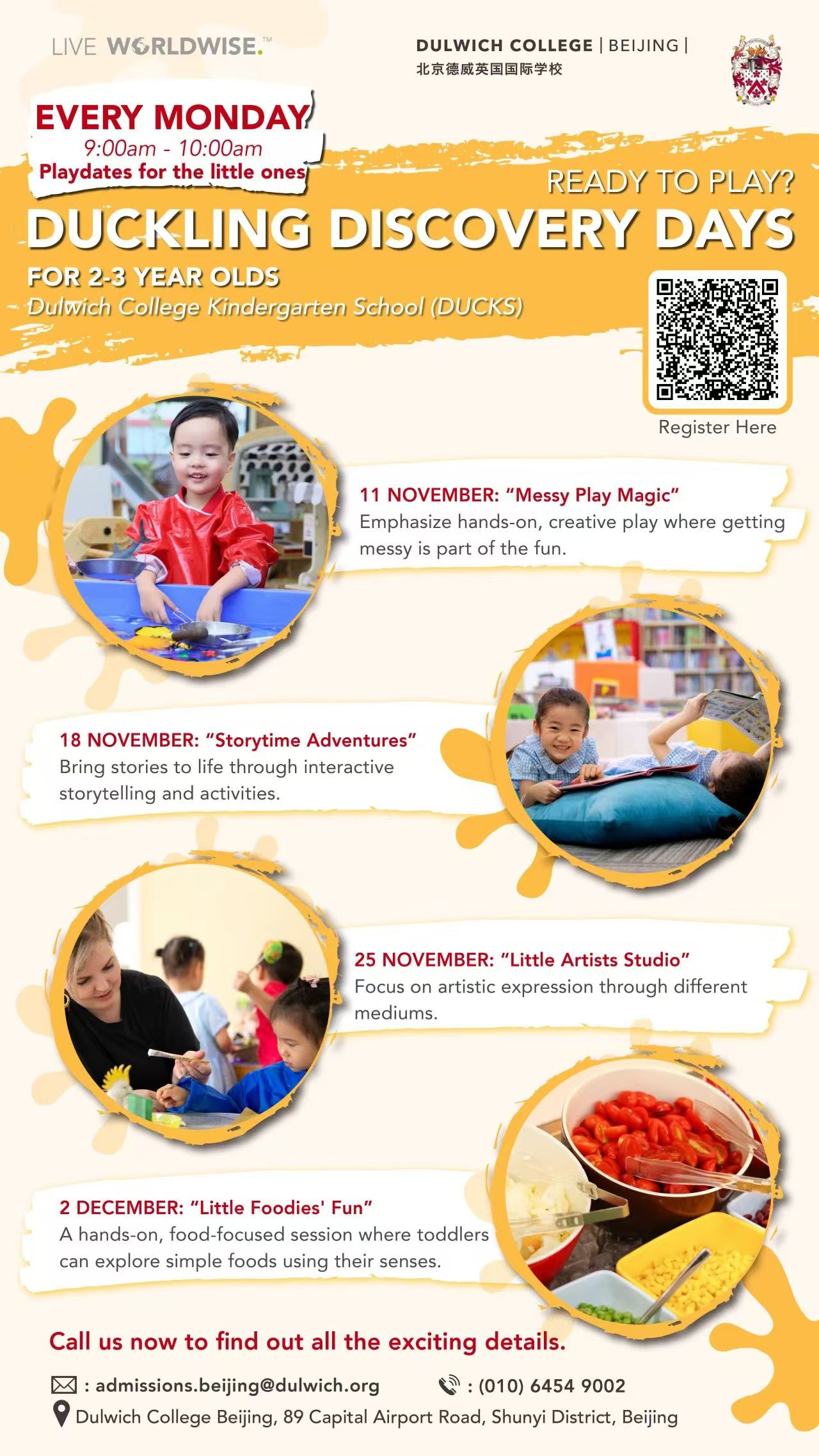 Join Dulwich College Beijing for Duckling Discovery Days, a delightful series of playdates crafted just for 2-3 year olds at DUCKS – Dulwich College Kindergarten School. Each Monday morning, little ones can explore the world around them in a safe and engaging environment filled with hands-on, sensory fun!