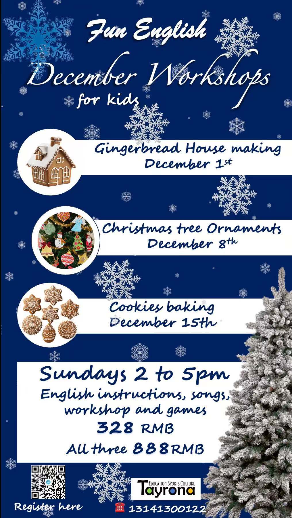 Let your little ones dive into the holiday spirit with these creative, hands-on English workshops! Perfectly designed to engage kids while building their language skills through festive fun, these workshops are filled with exciting activities and joyful learning. Activities Include: Cookie Baking: Dec 15. From 2pm to 5pm, kids will enjoy English instruction, holiday-themed songs, interactive workshops, and festive games.