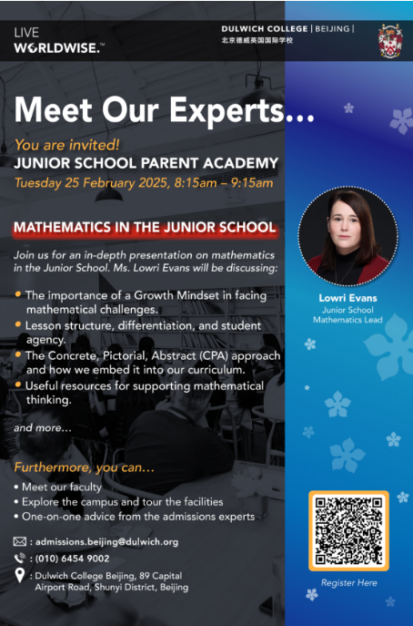 Dulwich College Beijing welcomes prospective families with children aged 7-10 to this on-campus parent workshop. In this workshop, Ms. Lowri Evans, Junior School Mathematics Lead will give an in-depth presentation on mathematics at DCB.