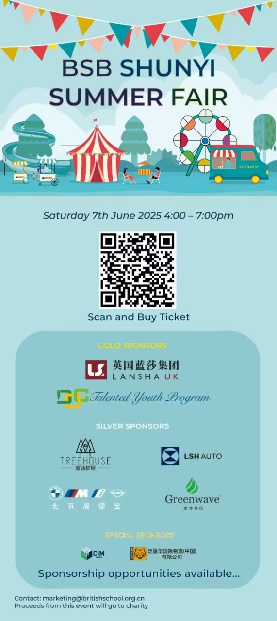 Celebrate summer with the BSB Shunyi community at the Summer Fair on Sat, Jun 7, from 4pm to 7pm. Enjoy family fun, food, games and entertainment while supporting a great cause. Proceeds go to charity. Sponsorship opportunities available. For details, contact: marketing@britishschool.org.cn. Tickets available by scan. Don’t miss this vibrant afternoon of community and giving.