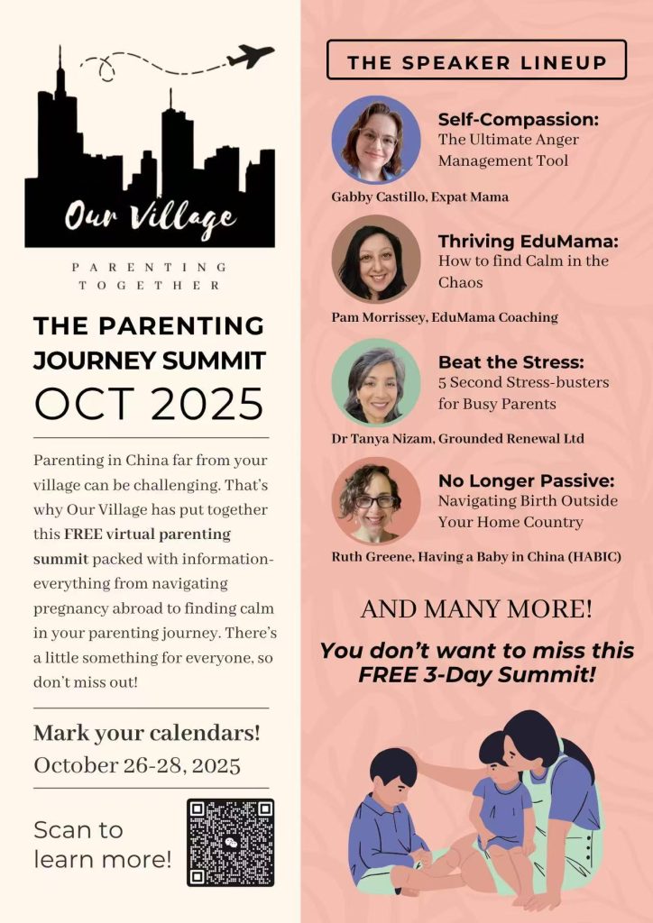 Hosted by Our Village, this free three-day virtual summit helps parents abroad thrive. Hear from experts like Gabby Castillo, Pam Morrissey, Dr. Tanya Nizam and Ruth Greene on topics from managing stress to parenting far from home. Discover calm, confidence and community in your parenting journey – don’t miss out!