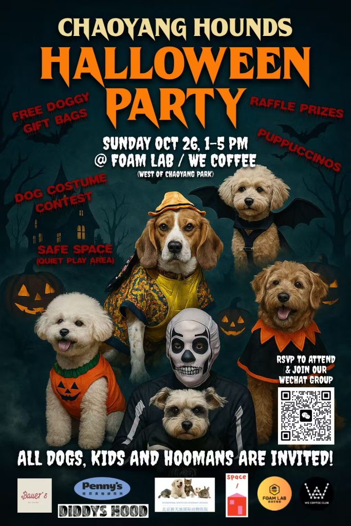 The Chaoyang Hounds host a Halloween party on Sun, Oct 26, from 1pm-5pm. The event is at Form Lab/We Coffee, west of Chaoyang Park. All dogs, kids and humans are invited to enjoy a dog costume contest, gift bags, raffle prizes and a play area. Entry is free.