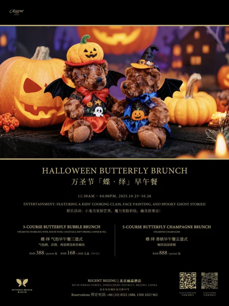 Celebrate Halloween in style at Regent Beijing’s Butterfly Brunch! Enjoy a three-course Bubble Brunch (RMB 388/person, RMB 168/child) or a five-course Champagne Brunch (RMB 888/person) with unlimited drinks. Fun for all ages, with a kids’ cooking class, face painting and ghost stories!