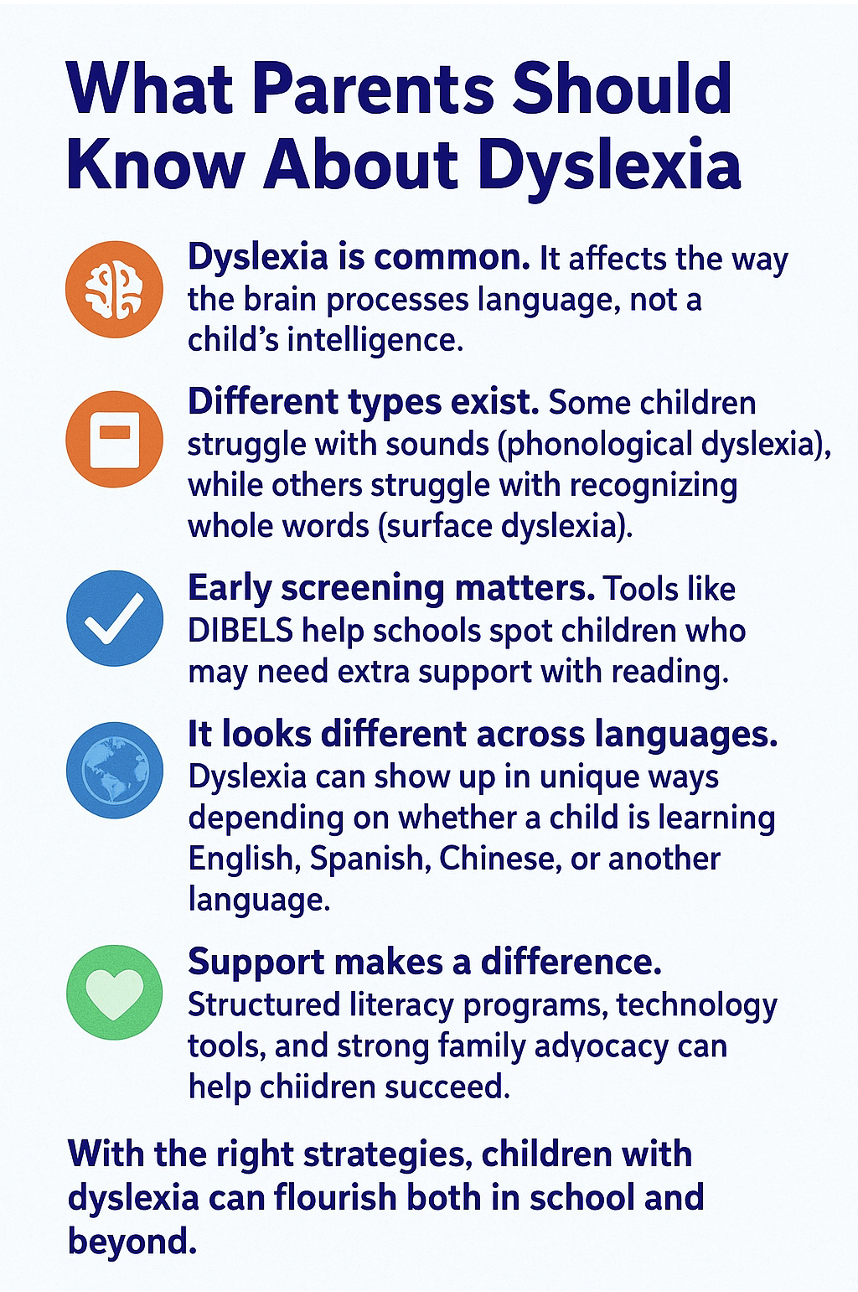 While DIBELS does not diagnose dyslexia, it serves as a valuable early-warning system. When combined with further evaluations and professional assessments, it helps schools determine which students need targeted reading interventions. For families, knowing that their child’s progress is closely tracked can be reassuring and can lead to earlier support if challenges arise.