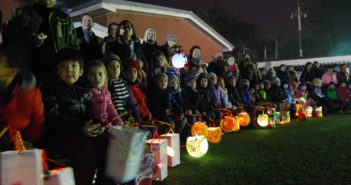 A procession of brightly colored lanterns winds its way down the darkening lane, to the…